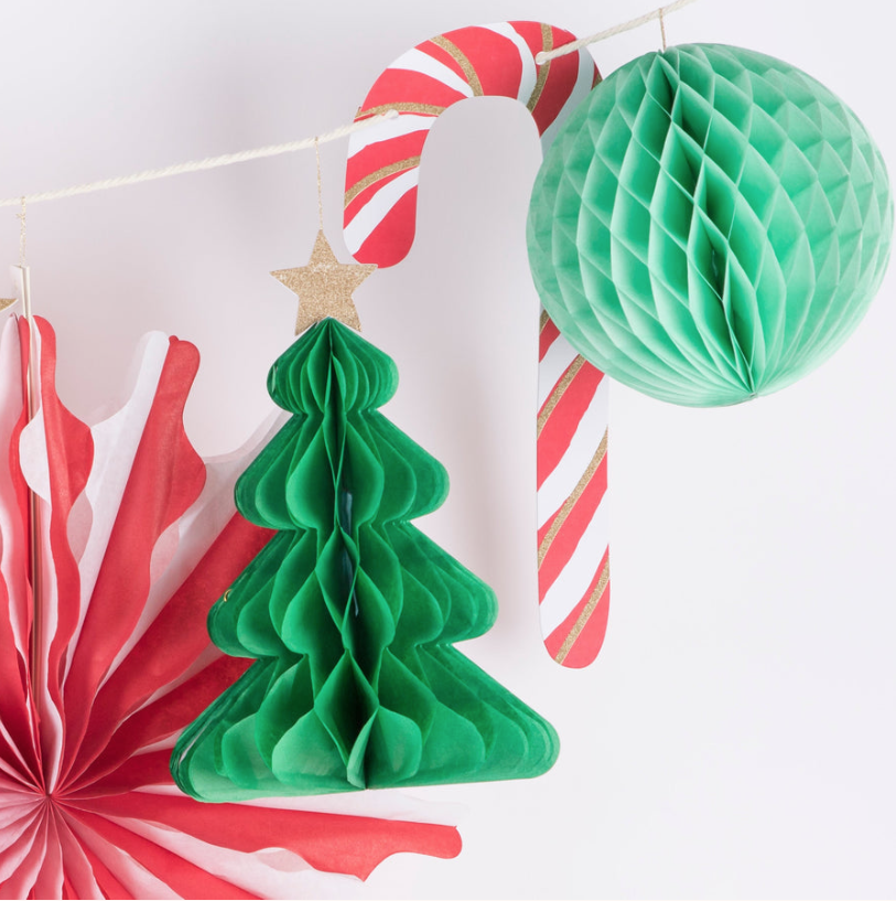 This gorgeous garland will make your home look absolutely stunning during the holidays. It is beautifully designed and crafted with 3D honeycomb details, and seasonal colors, for a spectacular effect. 2 tissue paper honeycomb red and white pinwheels 2 tissue paper honeycomb white snowflake pinwheels 2 each of tissue paper honeycomb pale pink and mint balls 2 green tissue paper honeycomb dark green Christmas trees Striped candycane and star pennants with gold ECO glitter, to attach to the garland 14 Gold paperclips included to hold the honeycomb decorations open Natural twisted cotton rope Simple self assembly required Packaging made using sustainable FSC paper Eco-friendly glitter Product dimensions: Garland length - 6' Measures 10' including excess cord Brand: Meri Meri Barcode: 636997278339