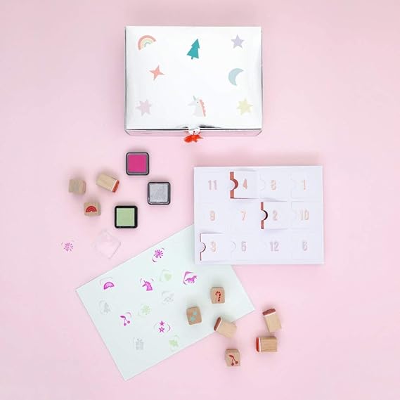 Countdown to Christmas with our enchanting Unicorn Themed Advent Calendar! This magical calendar offers 25 days of surprises, each featuring a new wooden stamp to add to your child's art collection. Each day reveals a delightful unicorn character, sparking creativity and joy as your child discovers a new treasure. After the holiday season, the beautiful keepsake box can be repurposed for stylish storage of jewelry, hair accessories, or cherished notes. A perfect holiday gift, this advent calendar is filled with cheer and creativity! Includes: 25 wooden stamps, 1 ink pad, and a themed gift box with 2 trays for counting down the days. Dimensions: 9 x 4 x 6 inches. Brand: Meri Meri Barcode: 636997255507