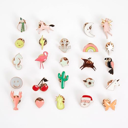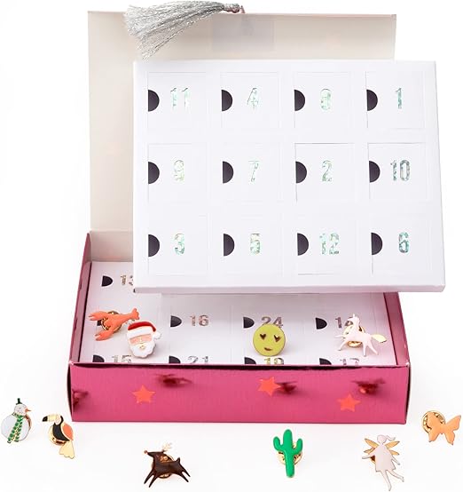 Celebrate the season with our Funny and Colourful Advent Calendar! Perfect for lovers of all ages, this unique calendar offers 24 delightful enamel pins instead of chocolate, ensuring a fun surprise each day without the empty box afterward. Each day reveals a bright and colorful pin featuring festive icons like Santa Claus and roses, along with fun motifs like cacti, unicorns, and carabiners—perfect for year-round wear. This special advent calendar includes numbered containers filled with these charming pins, making it a wonderful gift for boys and girls alike! Add a touch of joy to the countdown to Christmas with this delightful enamel pin advent calendar! Brand: Meri Meri Barcode: 636997255798