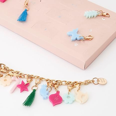 Discover our enchanting Ballerina Jewelry Box Advent Calendar! It features a silver elastic cord for easy opening and closing. Inside, you'll find a lovely dancing ballerina design and numbered trays filled with a gold-tone charm bracelet and daily charms. The charms include colorful acrylic shapes like butterflies, hearts, stars, and flowers, along with fun tassels and bells. This advent calendar is the perfect gift for kids who love stylish accessories, creating a beautiful charm bracelet for Christmas and beyond! Brand: Meri Meri Barcode: 636997272481